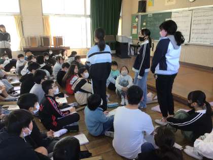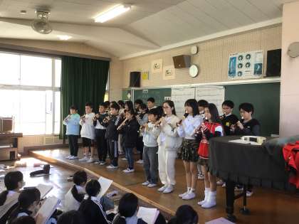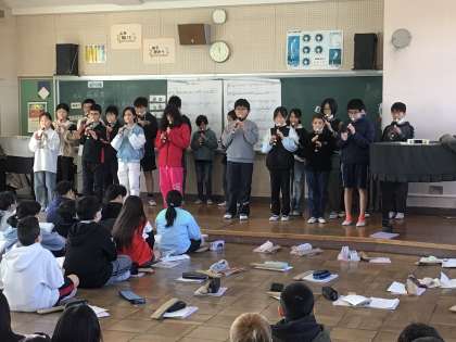 3/7 5年生音楽1 公開日 2025/03/07 更新日 2025/03/07 各学年から 5年生が音楽で学習してきた合奏や合唱を、4年生に向けて発表しました。リコーダーでは「威風堂々」の曲をクラスごとに発表しました。合唱では「マイバラード」をソプラノとアルトに分かれて、5年生全員で心を一つにして歌いました。合奏も合唱もとても上手でした。