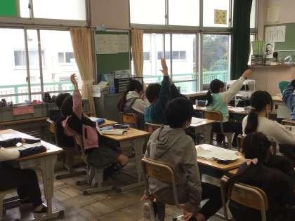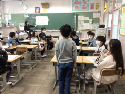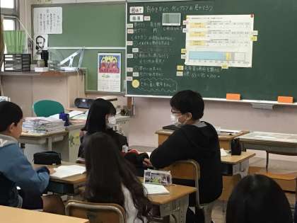 3/11 5年生算数2 公開日 2025/03/11 更新日 2025/03/11 各学年から 5年生算数では「割合」の学習をしています。今日は、割合を求めて何のグラフか見破ろうというめあてで、グループごとに話し合いました。話し合った後で、発表しました。みんな発表者を見てしっかり意見を聞いています。