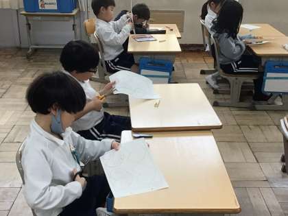 1年生の生活科では、1年間のまとめの学習をしています。今日は、ハートの形の用紙に、自分が活動して嬉しかったこと、褒められたことなどを書いたものを切り取りました。1年間で、嬉しかったことがたくさんありましたね。