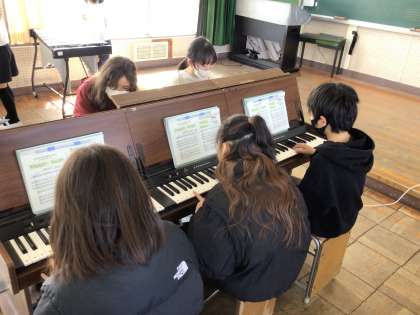 3/14 4年音楽 公開日 2025/03/14 更新日 2025/03/14 各学年から 4年音楽では、校歌や国歌の練習の後、「もみじ」を合唱しました。ワークを使って、「茶色の小びん」のまとめを行い、合奏でどんなことを気をつけたらよいかを考えました。「オーラ リー」と「茶色の小びん」の合奏もがんばりました。