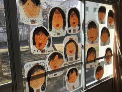 6年生の教室の窓に、似顔絵を貼りにいきました。6年生の素敵な似顔絵です。