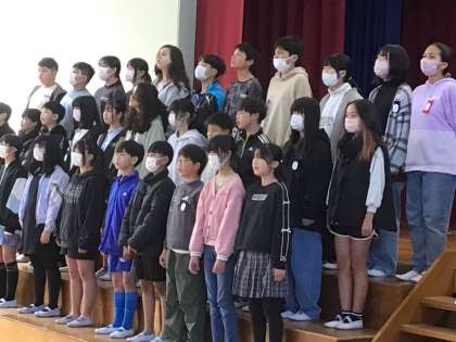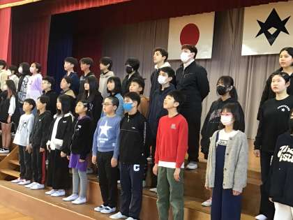 今日の式練習の様子です。会場にいる保護者、先生方、5年生に気持ちを込めてことばや歌を届ける練習をしました。