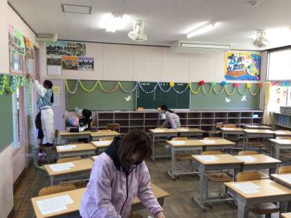 今日の卒業式準備の様子です。体育館の会場だけでなく、教室の飾り付けやさまざまな場所の清掃も行いました。