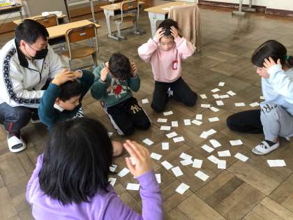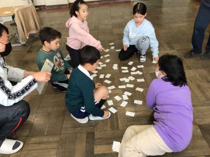 九九をとてもよく頑張ってきた子供たち。答えだけ書いたカードでカルタ取りをしました。勝者は1組チーム!九九はすべての計算のもとになるので、全員がしっかり覚えることができてよかったです。来年もいっぱい楽しく学んでくださいね!