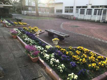 平井小学校の校庭では桜が咲き、すごくきれいです。中庭も公務手さんたちがこまめに手入れをしてくださって、パンジーがきれいに咲いています。今年度も学校の様子を配信していきますので、よろしくお願いします。