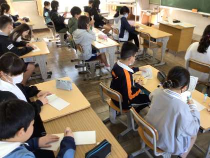 年度当初なのでかがやき(読書タイム)の時間はなく、8時25分から普段より長めの朝の会の時間を設定しています。連絡事項など先生の話をしっかり聞く姿が見られました。6年生は日記を始めていくようで説明がされていました。1年後の中学校進学を見据えて少しずつ文章が書けるようになるといいですね。