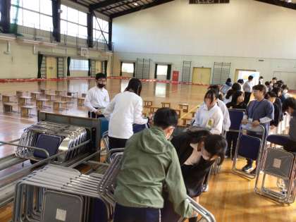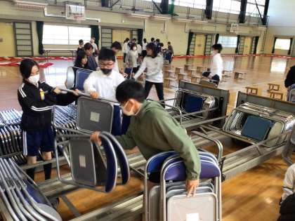 4/9 入学式会場の片付け1 公開日 2025/04/09 更新日 2025/04/09 各学年から 6年は朝の会後体育館に移動して、昨日の入学式の会場の片付けを行いました。体育館に集合して説明を聞く姿勢はさすが最上級生ですね。指示された分担で、椅子や机、紅白幕などの片付けを手際よく進めました。