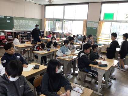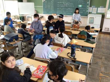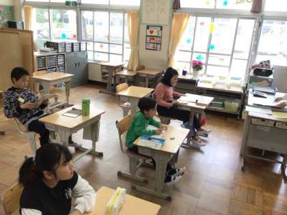 8時25分までに翌日の連絡を記入したり、提出物を前の机に出したりしています。新しい学級でも友達と楽しく談笑する姿が見られました。