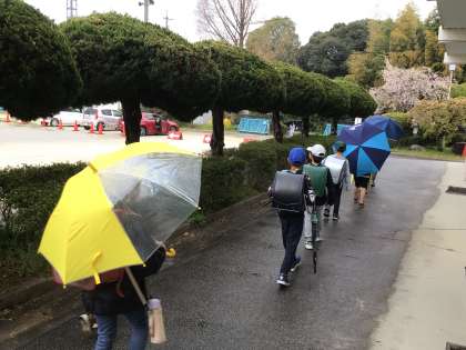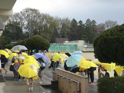 ちょうど子どもたちが下校する時間は小雨になりましたが、2限途中から雨に。当初月曜日に時間差一斉下校の練習を実施する予定でしたが、今日練習も兼ねて時間差一斉下校を行いました。通学団ごとに放送の指示にしたがって時間差で教室を出て、昇降口前で通学団で班員の確認をしてから下校をします。今後も天候が悪い日にこのような方法で下校をしていきます。