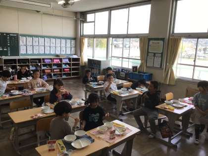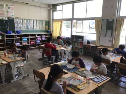 給食当番も自分の役割を早く覚えていきましょう。どの学級も会食を楽しんでいました。