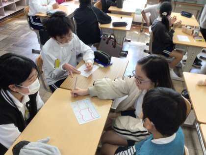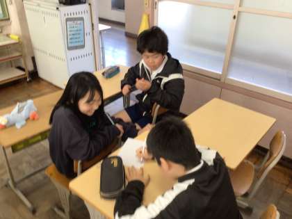 6年学活では、係の目標や役割分担を決めて掲示物を作っていました。係ごとに掲示物に貼る写真を廊下で撮影をしていました。