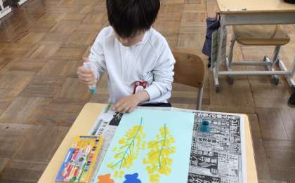 8組図工では、「菜の花」を作りました。スポンジに絵の具をつけてスタンプのように押して、菜の花を作りました。花の上に蝶々が飛んでいるようにして完成させました。
