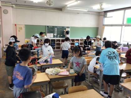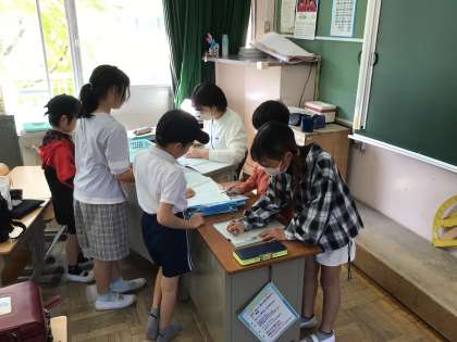 教室では友達と談笑しながら朝の支度をしています。係の仕事をてきぱき進めている子の姿も見られました。