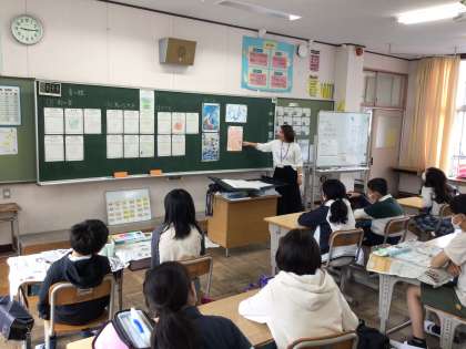 6年図工では、音の絵という作品をつくっていきます。前回練習で雨の音、鳥の鳴き声、たき火の3つの音を聞き、ワークシートに絵を描いてみました。それを紹介しながら、今後どのような手順で作品をつくっていくのか説明を受けていました。