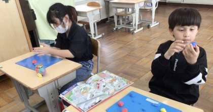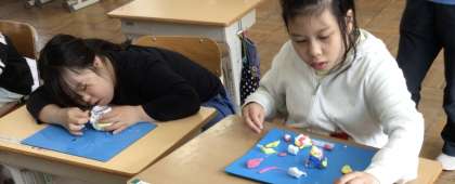 8組図工では、紙粘土と空瓶を使って、綺麗な入れ物を作りました。いろいろな色を作ったり、ビーズや飾りを付けたりして、完成しました。