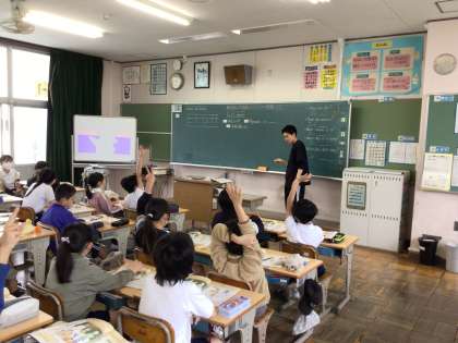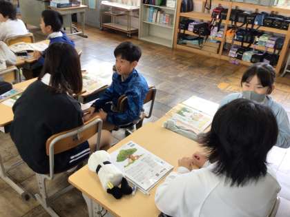5年外国語では、Unit1 Hello,frienndos! のページをやっていました。「好きなものや名前のつづりについて会話しよう」というめあてで学習を進めていました。先生の発問にすばやく反応していました。