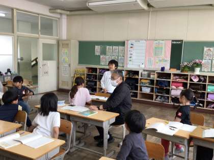 「すいせんのラッパ」の学習です。「グローブのようなかえる」「リボンのようなかえる」など様々なかえるが出てくる物語です。それぞれのかえるの様子が伝わるように読むにはどのように読むといいのかを話し合いました。