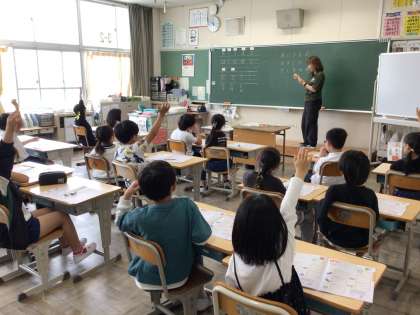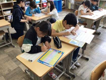 ローマ字の学習です。ローマ字ノートの練習の後に、「いし」「つくえ」など身の回りにあるものをローマ字で書きました。ローマ字表を確認しながら丁寧に書くことができました。