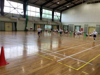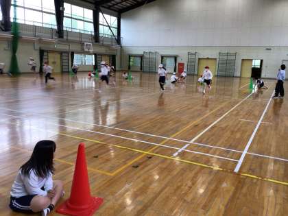 4/23 6年体育1 公開日 2025/04/23 更新日 2025/04/23 各学年から 6年体育は、体育館で1組と2組合同で実施していました。コーンで示されたゾーン内をダッシュしたり、2人組でボールをパスしながら移動したりするなど、夢中になって活動していました。