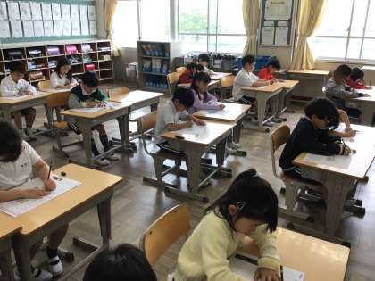 2年生書写では、「書き順に気をつけて書こう」というめあてで学習しました。上から下へ書く書き順や、外側から内側へ書く書き順等に気をつけて、丁寧に書きました。