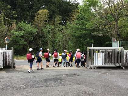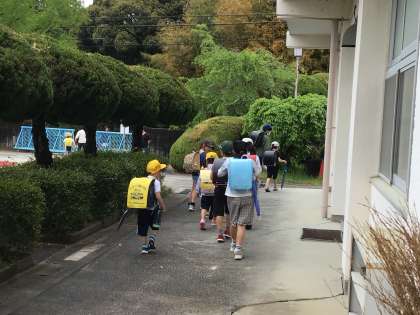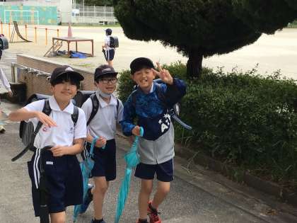 今日は全校5時間授業で14時50分の一斉下校の日です。幸い子どもたちが下校する時間帯は雨が止んでいましたが、運動場の状態がよくありません。そのため時間差一斉下校(雨降り下校)としました。
