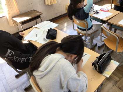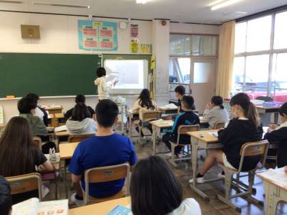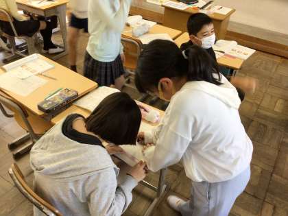 6年算数では、「点対称な図形をかこう」というめあてで学習を進めていました。対称の中心や点対称な図形の性質の復習を行った後、実際に作図をしてみました。作図の仕方の説明を聞いた後、まだ作図が完成していない子に対して教え合って進めていました。