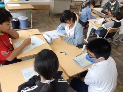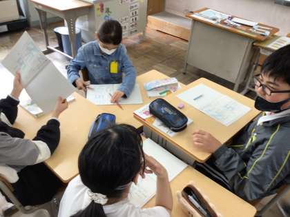 4/25 6年算数2 公開日 2025/04/25 更新日 2025/04/25 各学年から 2組では、「点対称のひみつを探ろう」というめあてで学習を進めていました。授業導入時に復習をしたことがらなどを用いて、個人探究の後、班で話し合って進めていました。