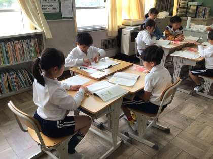 「すいせんのラッパ」の学習です。グループで音読発表会の練習をしました。誰がどこを読むか役割分担をした後に、どのように読むとよいか考えました。「こうやって読むといいよ」とグループの友達にアドバイスをし合う声が聞こえました。