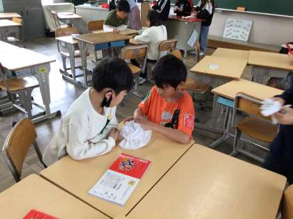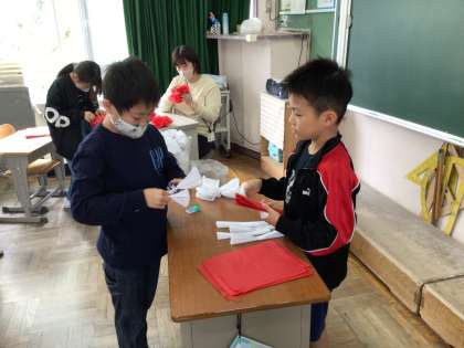1年生を迎える会のために、お花紙でお花を作りました。薄いお花紙を破らないように一枚一枚丁寧にはがしていました。心のこもったお花はきれいですね。きっと1年生も喜んでくれると思います。