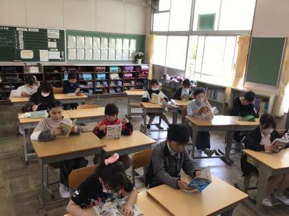 8時25分のチャイムでどの学級も静かに読書が始まりました。よい姿勢で本を読んでいる子が多い印象です。よいことは継続していきましょう。