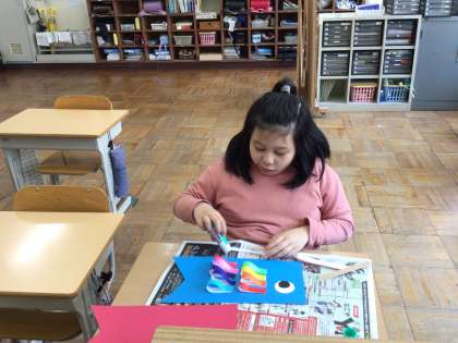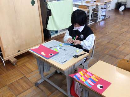 8組図工では、「こどもの日」にむけて「こいのぼり」を作りました。赤と青の色画用紙に、目とうろこを色紙や厚紙を使って作りました。