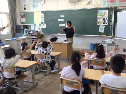 2年生は外国語に親しみました。英語であいさつをしたり、じゃんけんをしたり、数字を数えたりしました。
