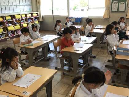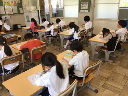 1年生国語で、ひらがなプリントの学習をしました。そのひらがなを使った言葉を発音したり、書いたりしました。