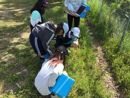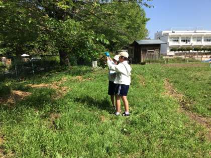 校庭で春の生き物を観察しました。花が散った後の桜の木に小さな実ができていることを見つけたり、よく見ないとわからないぐらい小さな虫が草にいるのを見つけたり、ぱっと見ただけでは分からないものをよく見ることで見つけることができました。