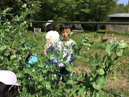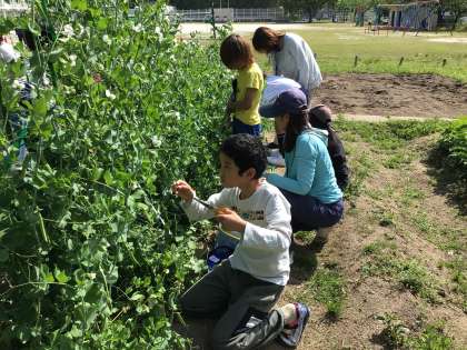 畑で育てているスナップエンドウの収穫をしました。ぷくぷくとおいしそうに育っている実を見つけてはさみで上手に収穫できました。様々な方向から見て、葉のかげに隠れている実を見つけていました。