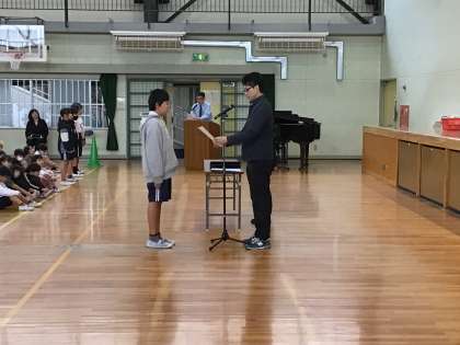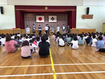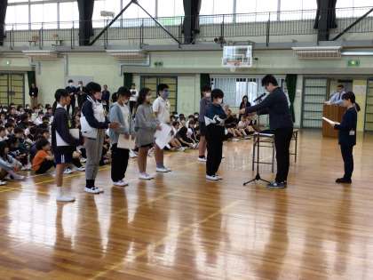 5/2 前期認証式 公開日 2025/05/02 更新日 2025/05/02 特別活動 体育館に全校児童が集まり、前期の学級委員や委員長の認証式を行いました。名前を呼ばれた学級委員や委員長は大きな声で立派な返事ができました。委員長からは前期の委員会の取り組みや全校のみなさんへのお願いの話がありました。聞いている人の方を見ながら話す委員長の姿は全校のみなさんのお手本になるほど素晴らしいものでした。