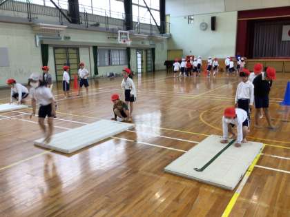 5/2 3年生体育1 公開日 2025/05/02 更新日 2025/05/02 各学年から マット運動です。まずはジャンプしたり、はいはいしたりしながら進み、体をほぐしました。前転も上手にできました。マットの片づけも友達と協力してさっとできました。