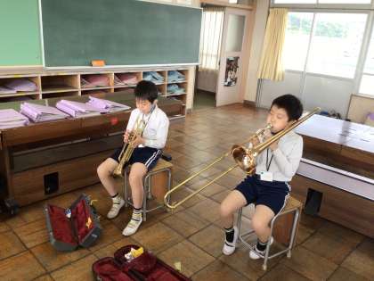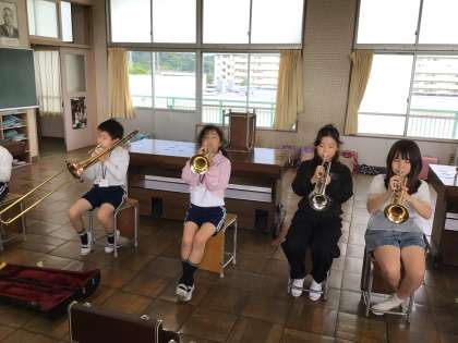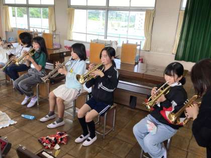 5/2 TBG2 公開日 2025/05/02 更新日 2025/05/02 各学年から 音楽室ではファンファーレのグループが練習をしていました。前回楽器の担当が決まったので、実際に楽器を触り、音を出していました。