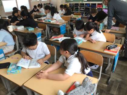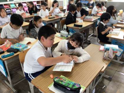 漢字辞典の使い方の復習から始まりました。まだ習っていない漢字を部首や画数をたよりに調べました。先に見つけた友達が調べた漢字の読み方をつい口にすると、周りから「言わないで」という声が。自分で調べたいという気持ちは大切ですね。