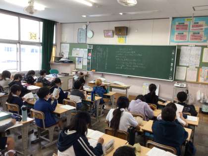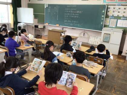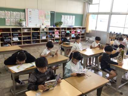 どんより曇った朝ですが、子どもたちは元気よく登校してきました。翌日の連絡の記入や授業の準備をすばやく行い、かがやきの時間になると静かに読書が始まりました。