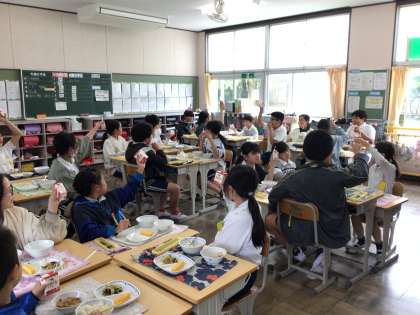 5/12 楽しい給食 公開日 2025/05/12 更新日 2025/05/12 特別活動 今日の献立は豚丼、牛乳、厚焼き卵、おかかあえです。 豚丼は新たまねぎを使っているので、たまねぎの甘さが感じられました。 5年生のクラスでは誕生日の友達をお祝いして、牛乳で乾杯をしていました。