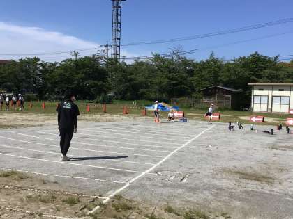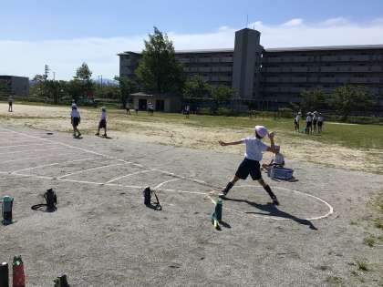 運動場でのソフトボール投げの測定の様子です。昨年度より遠くに投げることができたかな?