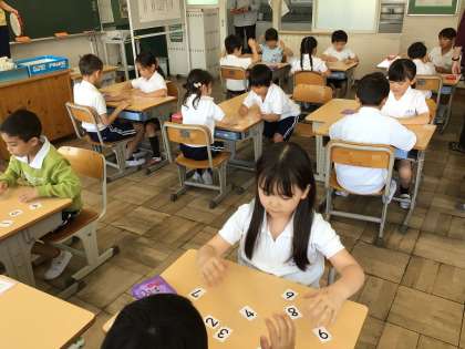 5/13 1年生算数 公開日 2025/05/13 更新日 2025/05/13 各学年から 1年生算数では、1から10までの数の学習をしています。ペアになって、先生がタンバリンでたたいた数の分の数字カードを取るゲームをしました。