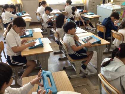 5/13 3年生社会科1 公開日 2025/05/13 更新日 2025/05/13 各学年から 3年生の社会科では、「学校のまわりの様子」について学習しています。今日は、白地図にタブレットで調べたことを書き込んだり、畑や田んぼなどに色をぬったりしました。