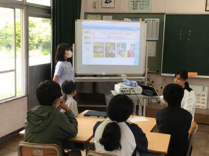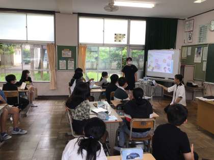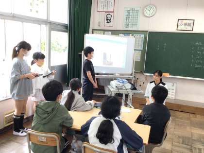 5/15 6年外国語 公開日 2025/05/15 更新日 2025/05/15 各学年から 6年外国語では、「好きなものや宝物などを紹介し合って互いのことをよく知ろう」というめあてで学習を進めていました。タブレットで作成した画面をもとにスピーチを行い、ALTの先生にパフォーマンスの評価をしてもらっていました。緊張しながらもしっかり発表していました。