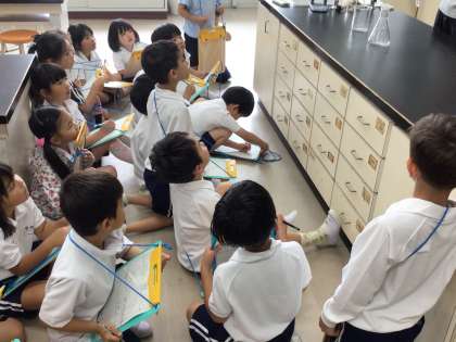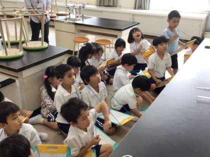1年生 生活科では、学校について学習しています。2年生と一緒に学校探検には行きましたが、まだわからないところがあったので、今日は理科室を探検しました。理科室にはどんな物があるか調べました。