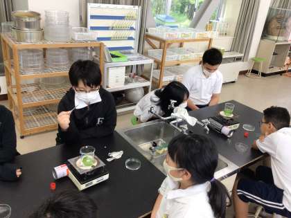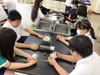 5/20 6年理科 公開日 2025/05/20 更新日 2025/05/20 各学年から 6年理科では、成長と日光の関わりの単元を学習しています。「葉にデンプンがあるかヨウ素液を使って調べよう」というめあてで実験を進めていました。アルミホイルで日光を遮断しておいた葉を使って実験していました。別の時間に日光が当たった葉を用いて実験をして比べるようです。班で協力して実験を進めていました。