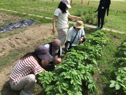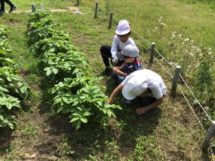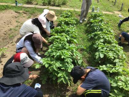 7・8組作業では、運動場西側の畑で農作業をしました。途中で水分補給の時間をはさみながら、草取り、水やりをしました。