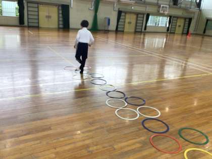 7・8組体育では、準備体操を行った後、ボールを使った5分間走やケンケンパ、なわとびなどをやりました。ケンケンパは全員が前回よりも軽やかで正確にとぶことができました。