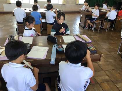 3年音楽では、国歌や「ハッピーソング」を歌ったり、茶つみの手遊び(リズム練習)をしたりしました。また、「おちゃらか ほい」をリコーダーで合奏した後、高いドとレの運指を覚えて、吹いてみました。「ドレミで歌おう」も歌詞やドレミで歌うだけでなく、オルガンでも演奏をしました。